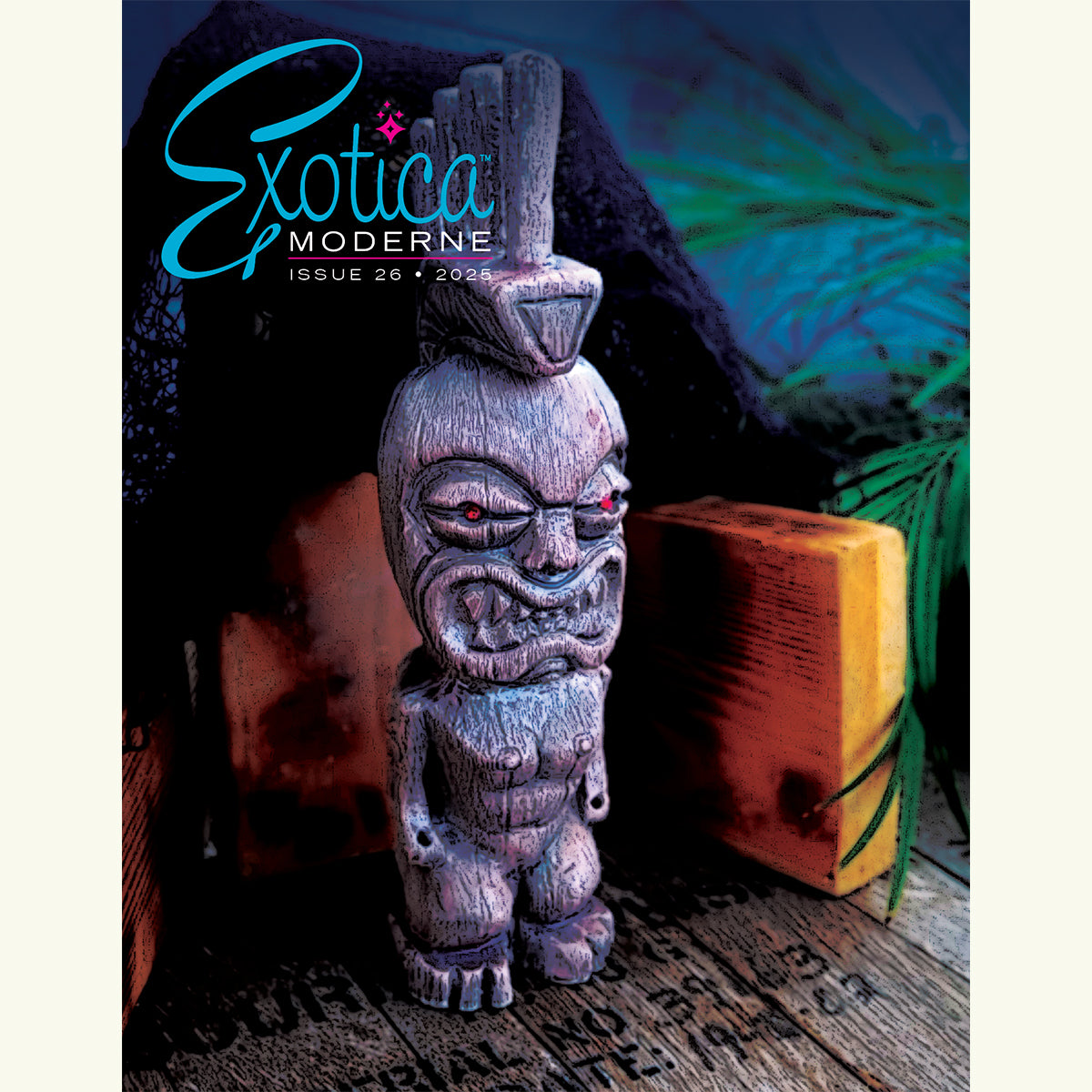 David Outl1n3’s work graces the cover of Exotica Moderne 26 as we feature his journey from a skateboarding psychobilly kid to one of Tiki’s most original artists. Kevin Crossman stops in at another Tiki famous artist, Woody Miller, and his newly-opened Pau Hana Studio. And, speaking of Tiki Famous, Shawn Gadberry pens the story of long-time EM contributor, Ray “Tiki with Ray” Wyland.