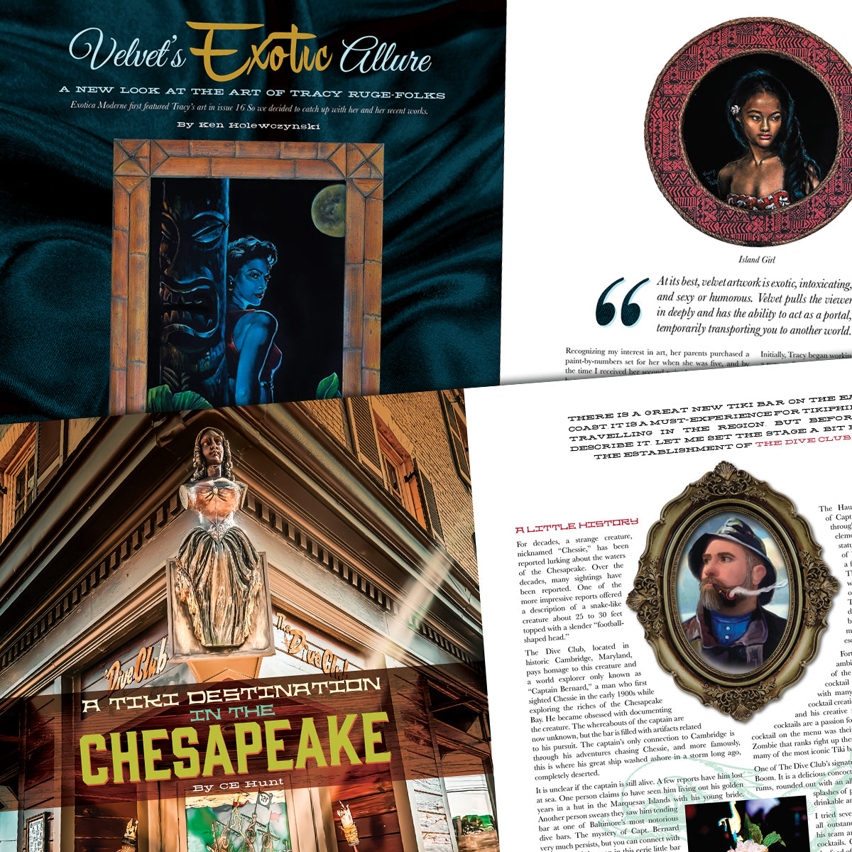 We are extremely excited to feature a fantastic cover by the esteemed John Mulder of Eekum Bookum Tiki Mugs (he just doesn’t only make the greatest Tiki mugs)! John’s painting features a mid-mod music party, and to celebrate, we decided to offer discounted magazine and music bundles. You can buy a standard single issue of Exotica Moderne, or select from several magazine and music bundles at huge savings. Then things kick off with Ray “Tiki With Ray” Wyland asking the age-old question “What makes a Tiki bar, a Tiki bar?”.