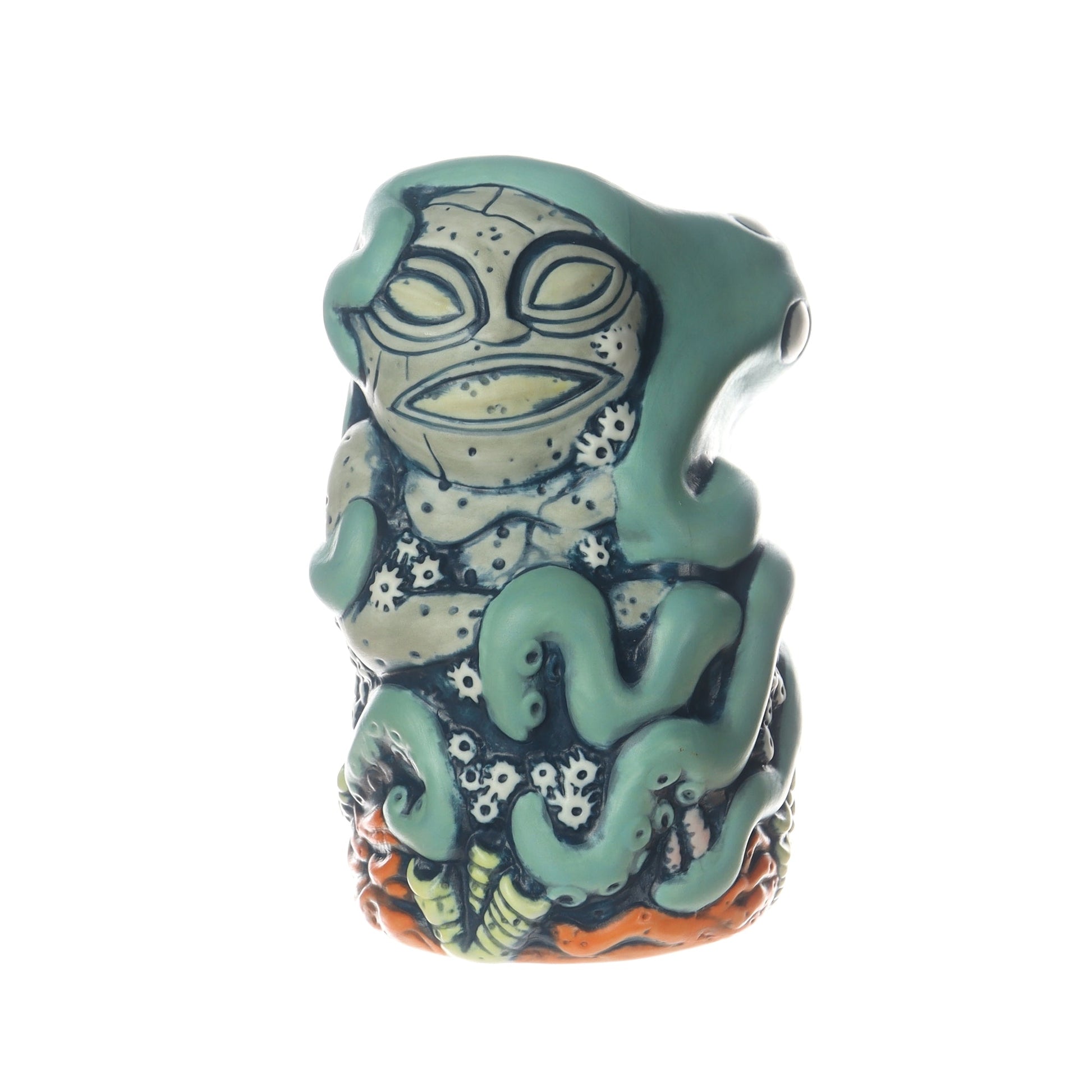 Inspired by a Tahitian Ti'i figurine traditionally used as a fisherman's good luck charm, Ocean Luck showcases the intricate textures of barnacles and vibrant coral through LowTiki's expertly handcarved design. With the charm now strangled by an Octopus at the ocean's depths, you wonder...did the fisherman make it back?