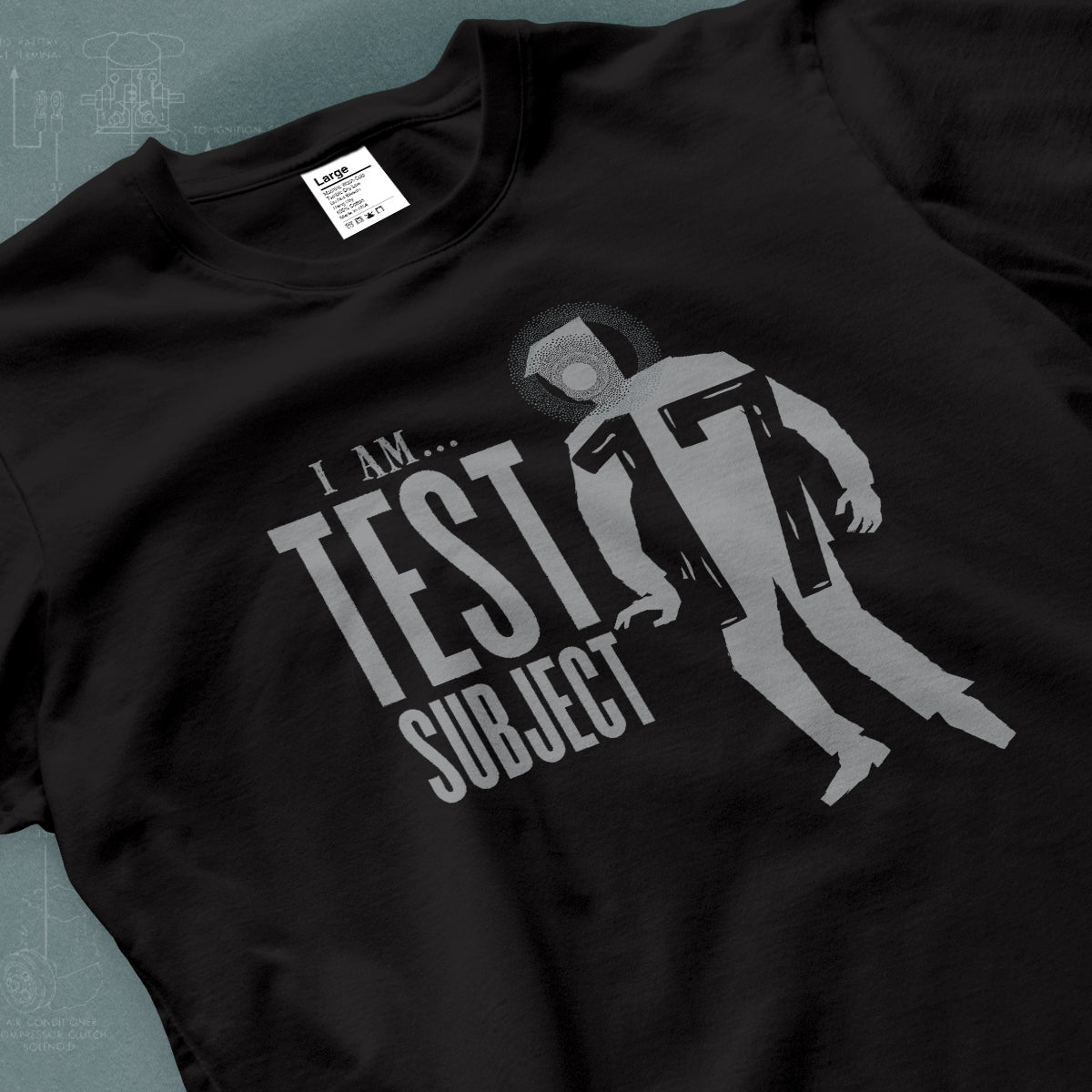 Test Subject 17 logo printed in gray on a 100% cotton black shirt.